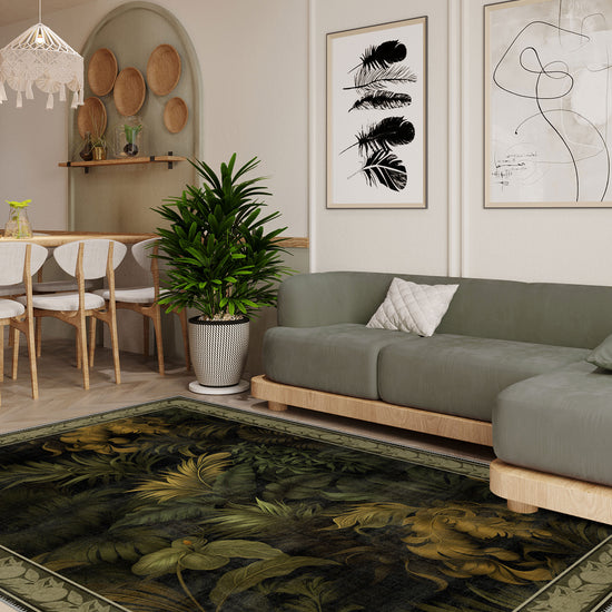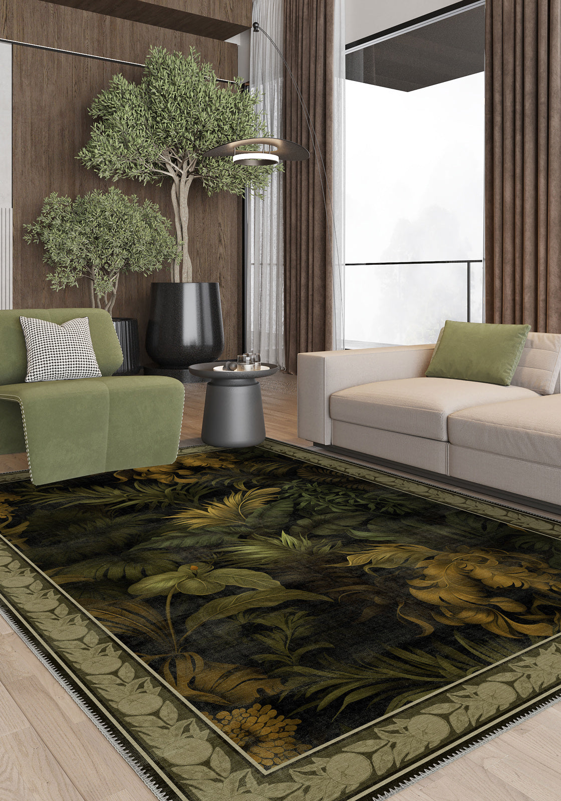 The Alaric Floral Green Rug captures the lush beauty of nature with its intricate botanical design, perfect for adding elegance and warmth to any room. Featuring deep green foliage complemented by warm golden accents, this rug brings a luxurious yet organic feel to your interior. The detailed border further enhances its sophisticated appeal, making it an ideal choice for traditional, exotic, or vintage-inspired spaces. With the added practicality of being machine washable, it combines style with everyday functionality.