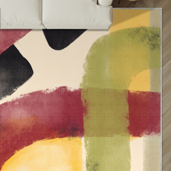 The Aleron Multi Coloured Abstract Rug is a bold statement piece that infuses any space with vibrant energy and artistic flair. Featuring sweeping brushstrokes in a dynamic mix of red, green, yellow, and black, this rug is perfect for adding a burst of color and creativity to contemporary living spaces or playful kids’ rooms. With its lively abstract design, it serves as both a functional and visually engaging element of decor.