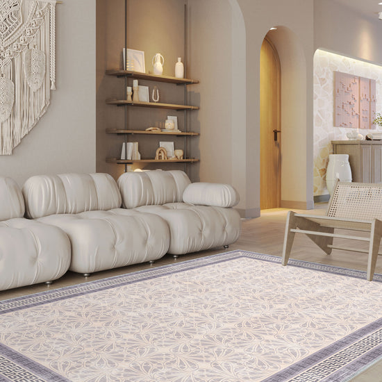 The Alexis Bordered Purple Rug offers a graceful design that enhances any interior with its intricate patterns and soft hues. The sophisticated Greek key border frames a delicate floral motif, making this rug a beautiful addition to both modern and traditional spaces. Its light purple tones create a soothing, calming ambiance while adding a touch of elegance to your décor.