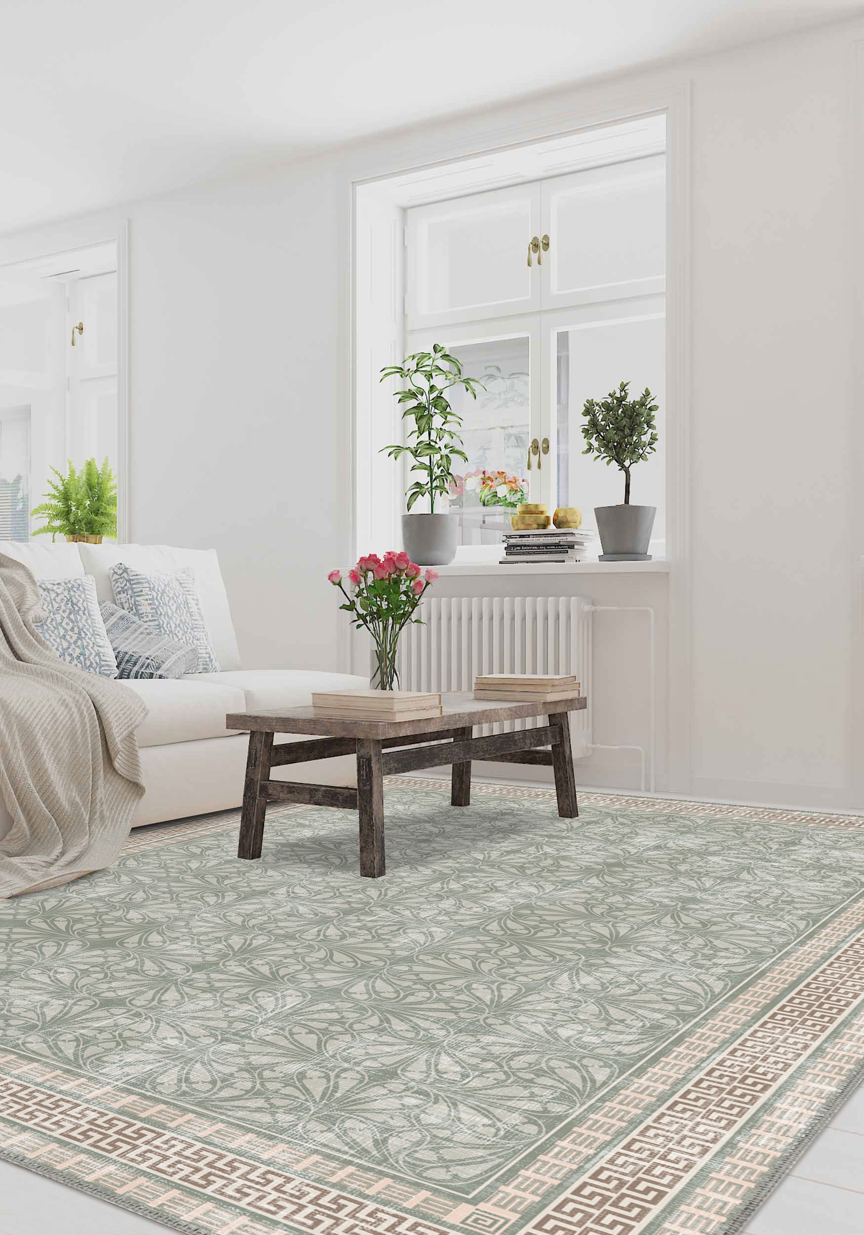 Elevate your interior décor with the Alexis Modern Bordered Washable Rug. Its sophisticated pattern, inspired by classic designs, is complemented by a structured Greek key border. Ideal for both modern and traditional spaces, this rug offers elegance with the convenience of machine washability.