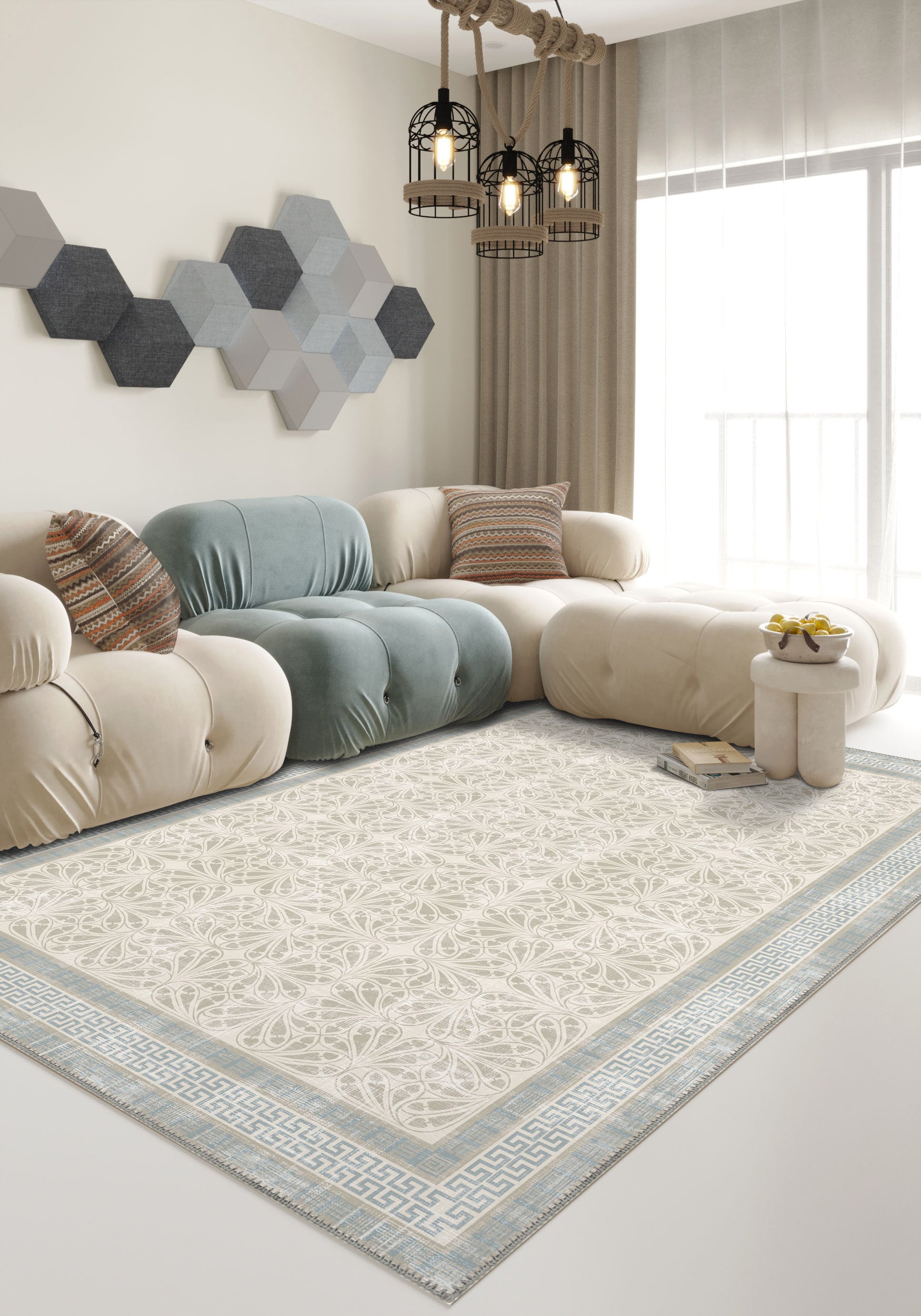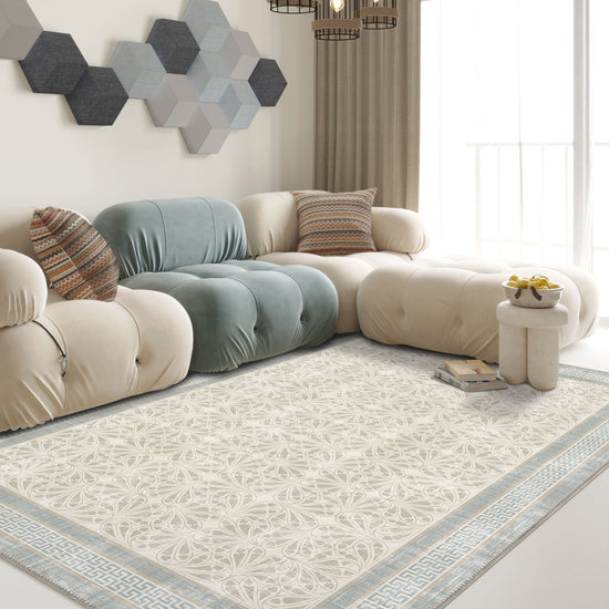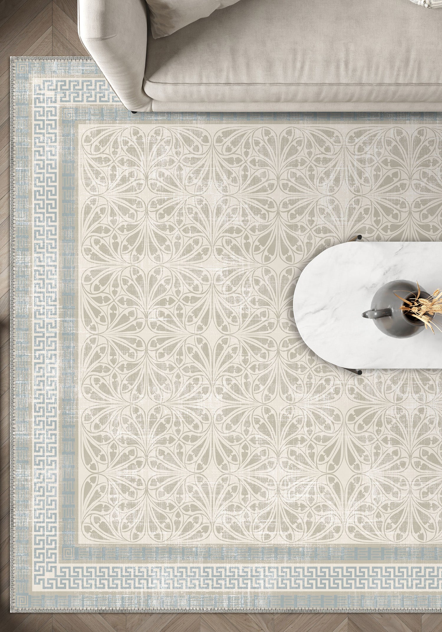 Transform your home with the Alexis Washable Bordered Rug, designed to bring both style and practicality to your space. Featuring an intricate floral design framed by a classic Greek key border, this rug adds a refined touch to any room while offering the convenience of being fully machine washable.