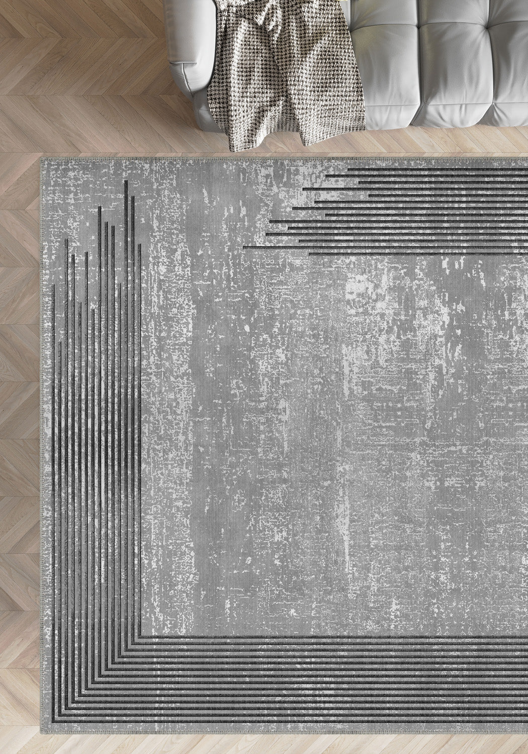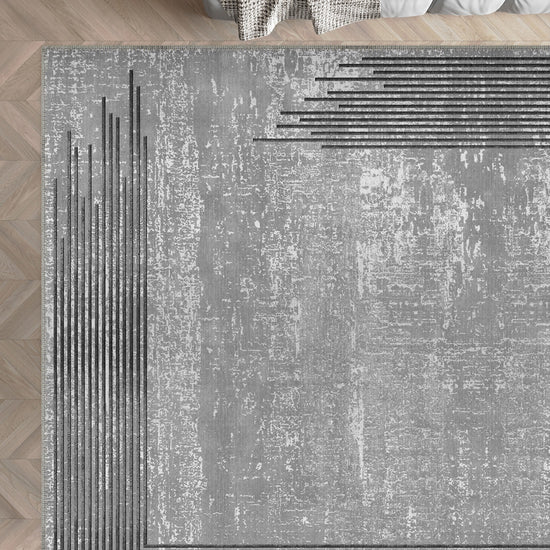 - Living Rooms: Add a touch of modern sophistication to your living space with the bold design of this grey bordered rug.
