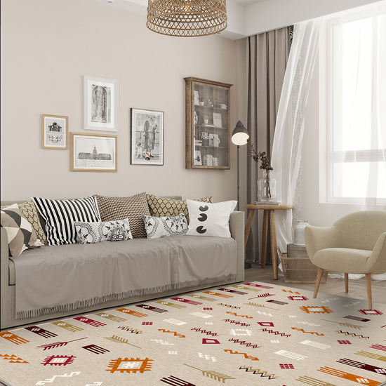 The Azra Beige Berber Rug draws on centuries of Moroccan tradition, reimagining tribal symbols with a modern spirit. Its warm beige base is scattered with joyful Berber motifs—diamonds, arrows, zigzags—in rich earthy tones like ochre, rust, burgundy and ivory. A contemporary twist on the classic Moroccan rug, perfect for interiors that crave soul and softness.