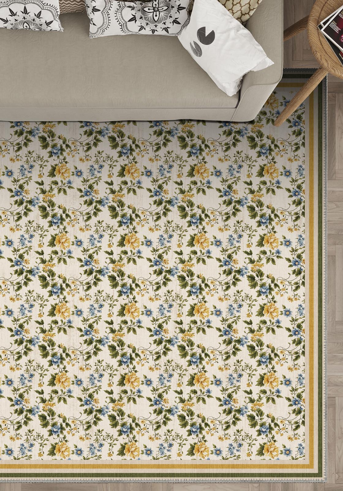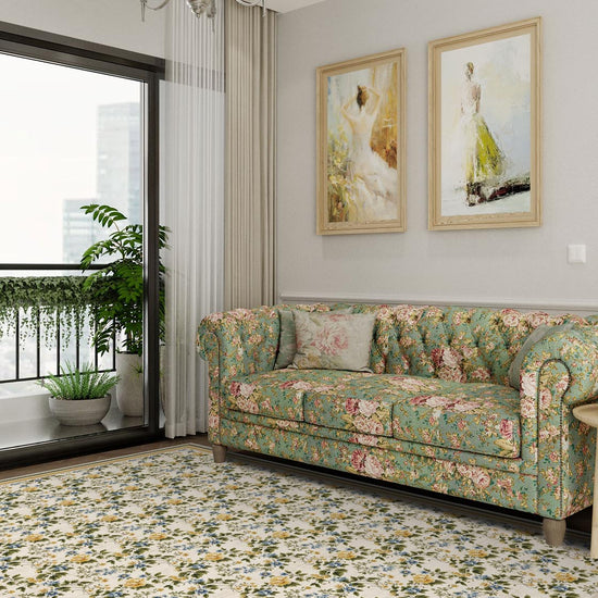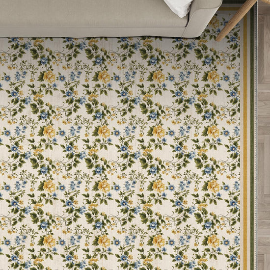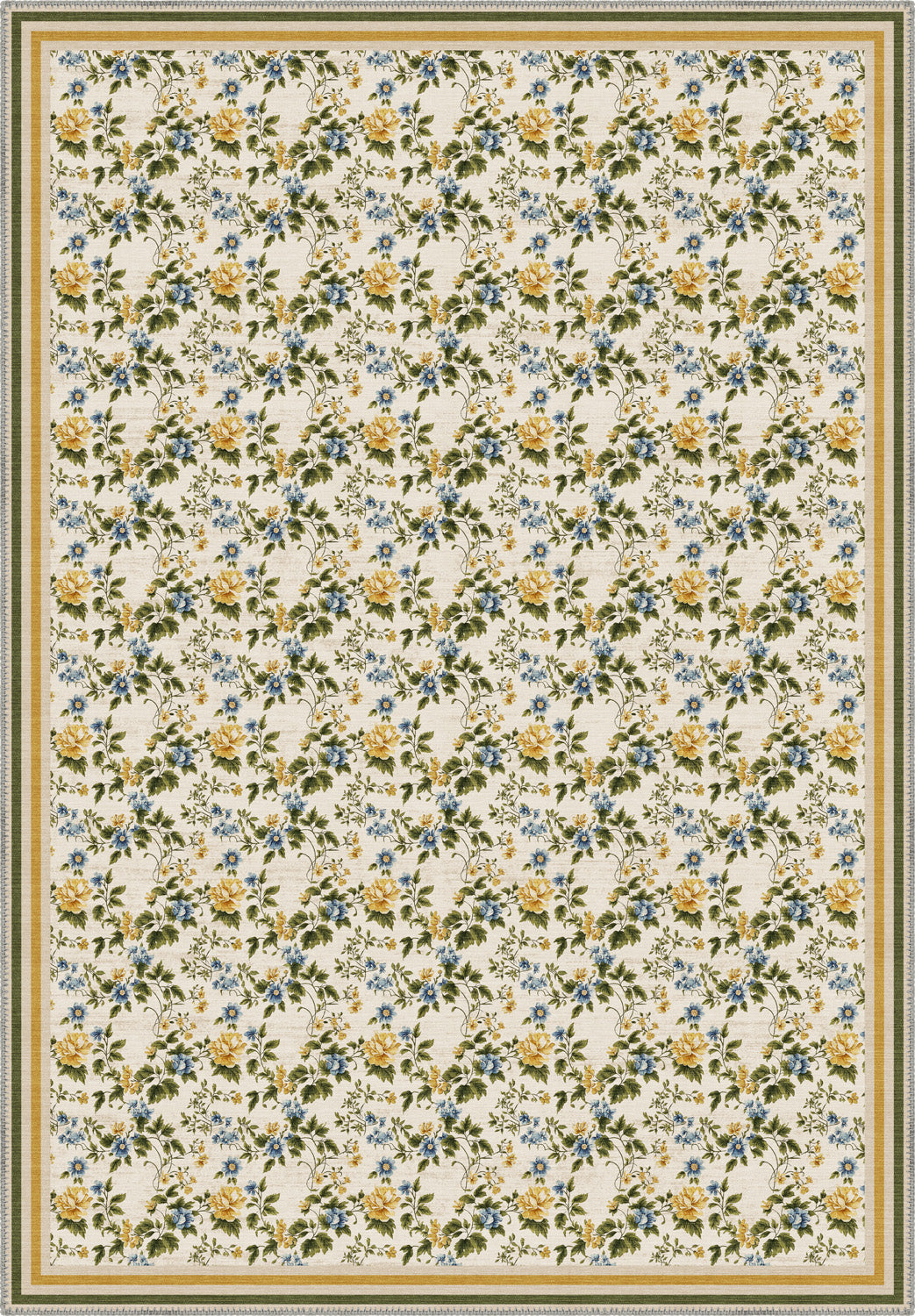 The Beatrice English Country Style Rug is pure countryside poetry beneath your feet. Its charming all-over floral print—delicate buttercup yellows, forget-me-not blues, and olive-toned foliage—feels like a vintage linen dress laid across a sunlit parlour. A country rug that whispers stories of handwritten letters, garden tea rituals, and the kind of beauty that never chases trends.