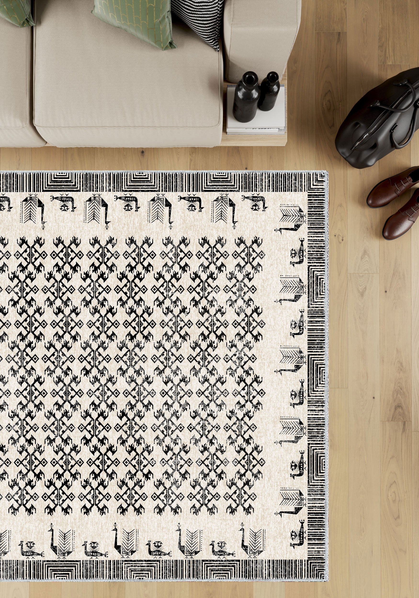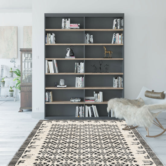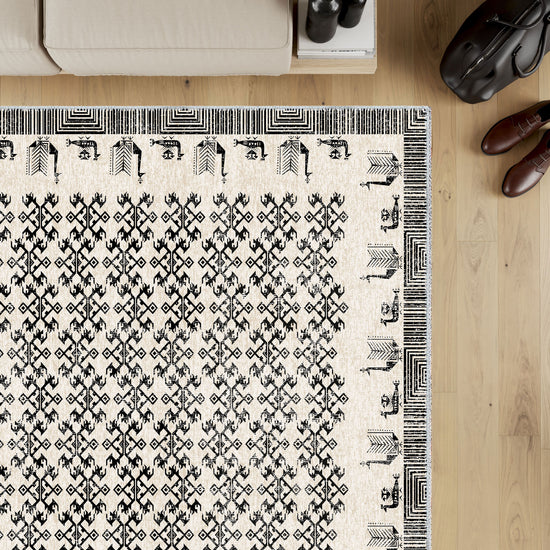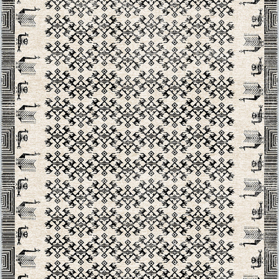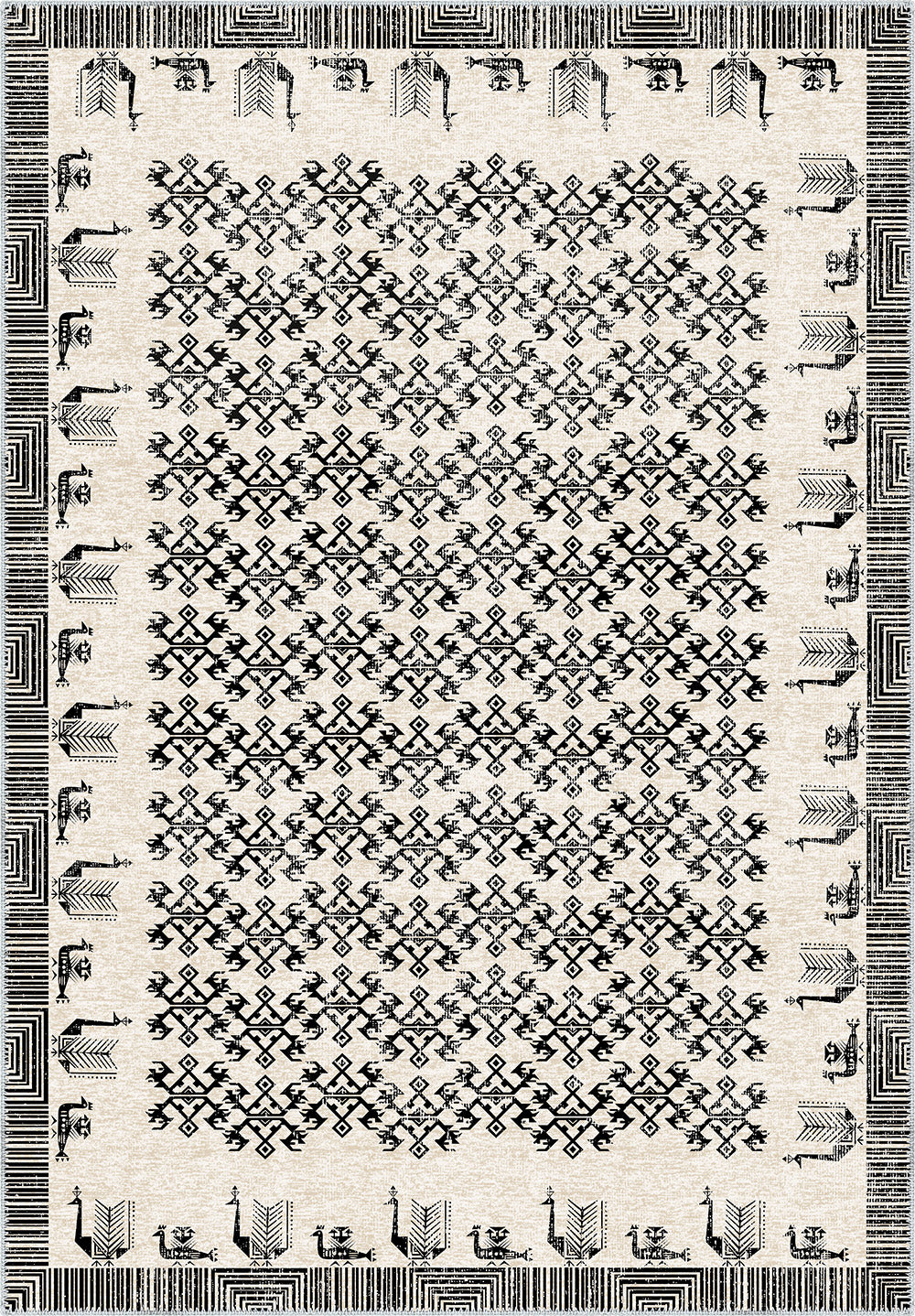 • Modern Interpretation: While rooted in heritage, this rug’s black-and-white color palette and minimalist lines offer a contemporary twist on a time-honored design.