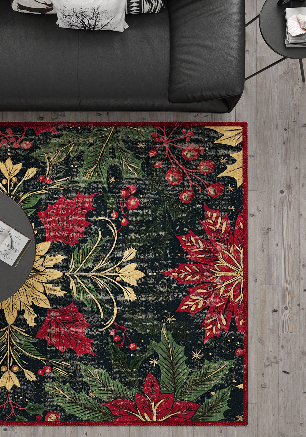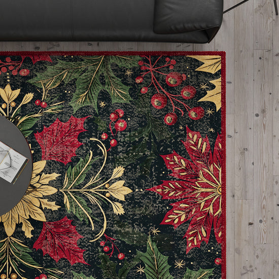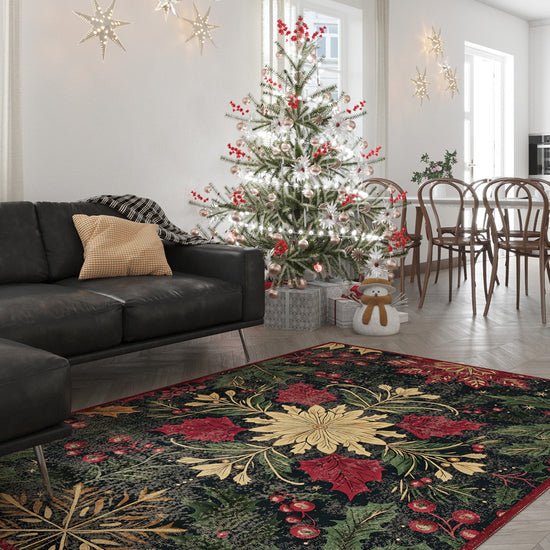 - Elegant Holiday Design: This rug features a beautiful blend of classic Christmas motifs, including holly, poinsettias, and ornamental leaves, making it a timeless holiday decoration.