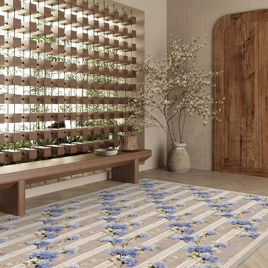 Celine blends botanical romance with everyday functionality. Its hydrangea blooms dance lightly across the soft beige ground, creating a rug that feels calm yet sophisticated. Whether you style it in a French country setting or a minimalist home, this beige floral rug is effortlessly elegant—and completely washable.
