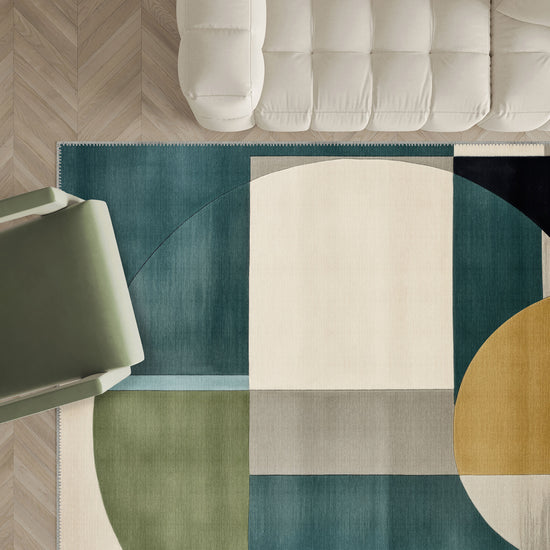 - Geometric Design: Featuring interlocking circles and rectangles, this rug brings a modern, abstract vibe to your home.