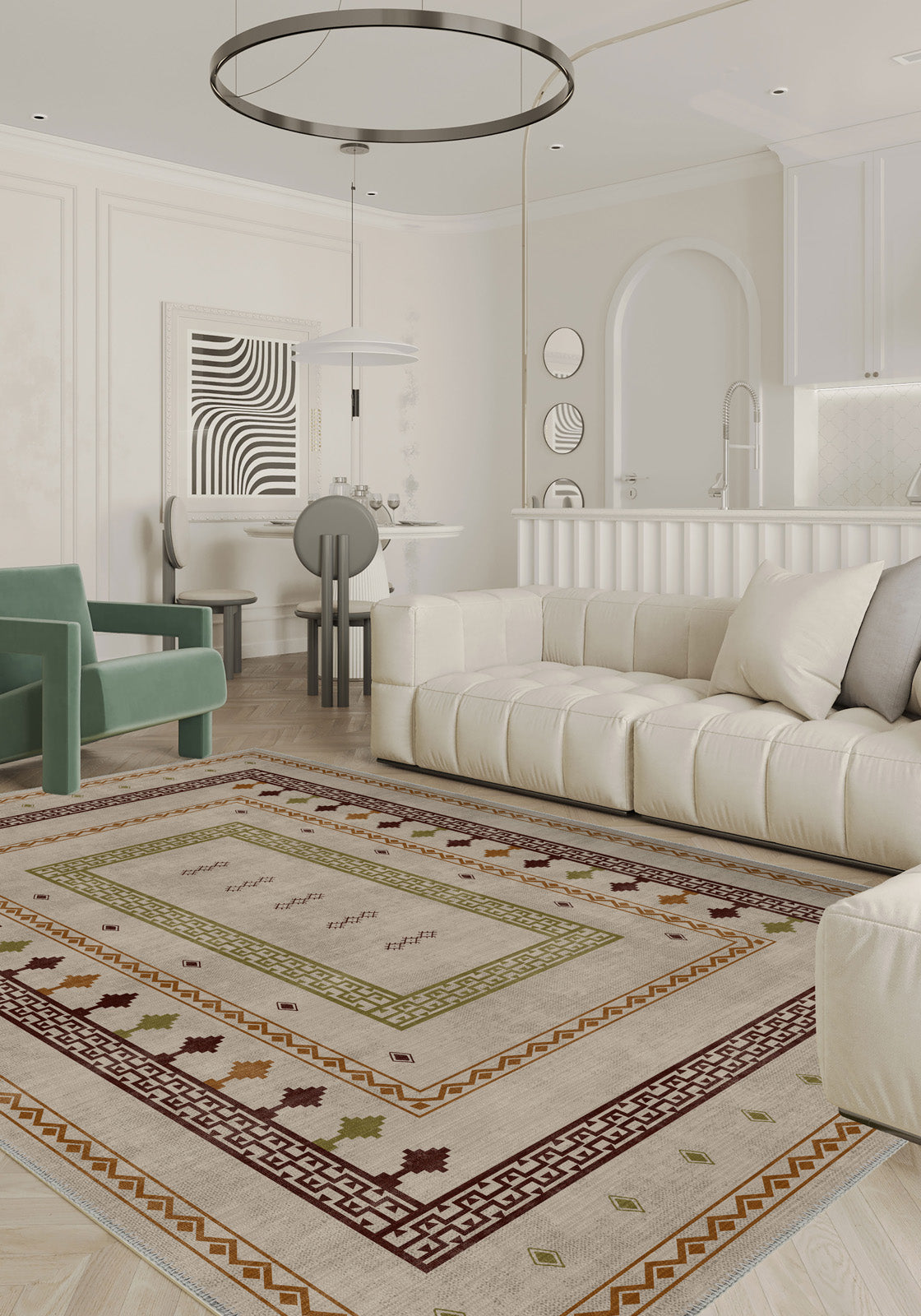 - Timeless Boho Design – An elegant geometric pattern in warm, earthy colours that complements various interiors.