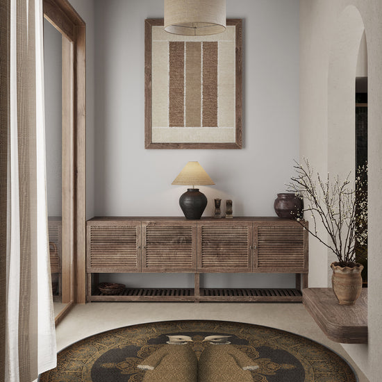 This rug deserves a stage. Place it in a living room with dramatic lighting, an eclectic study, or a gallery-inspired hallway. It’s also stunning in a minimalist space where its ornate pattern and characters can truly shine.