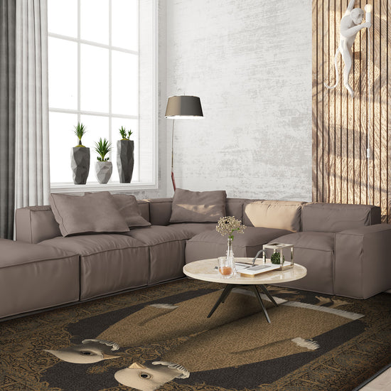- Muted tones with textural depth: The warm brown and charcoal palette is rich without overpowering, ideal for grounding bold spaces.