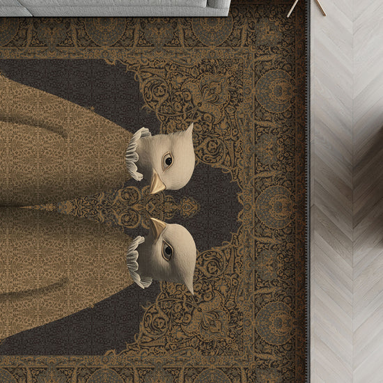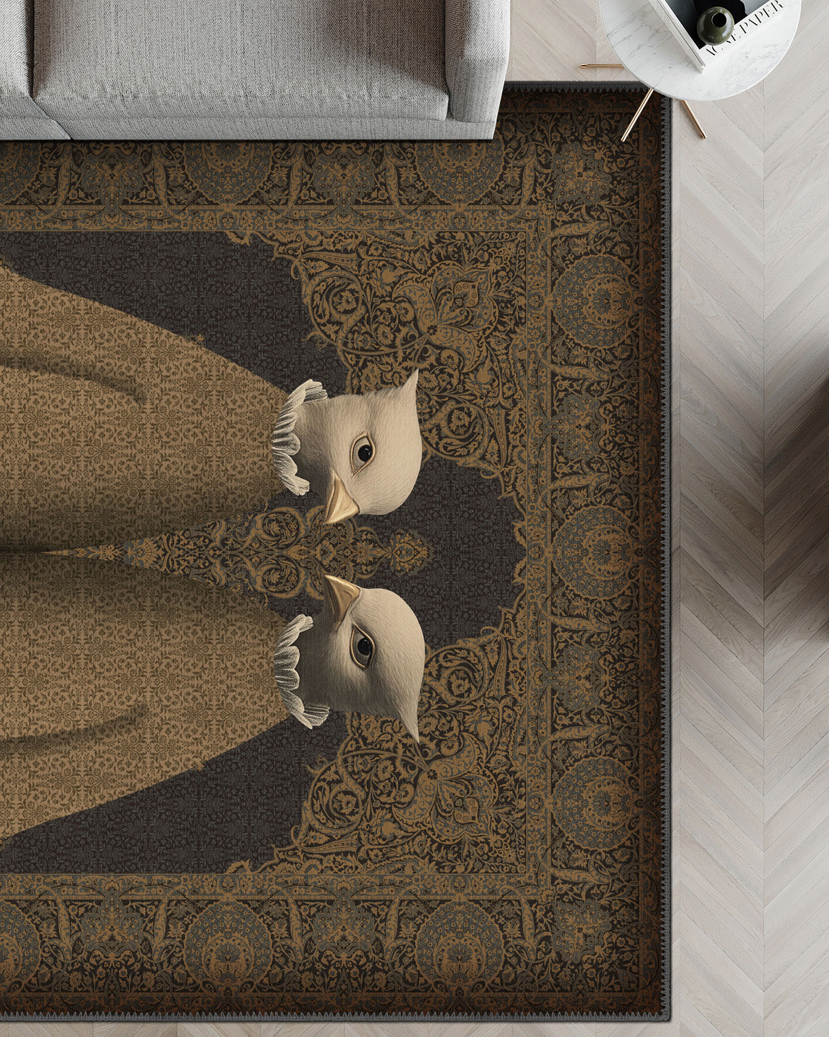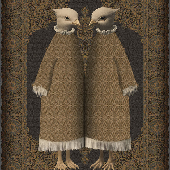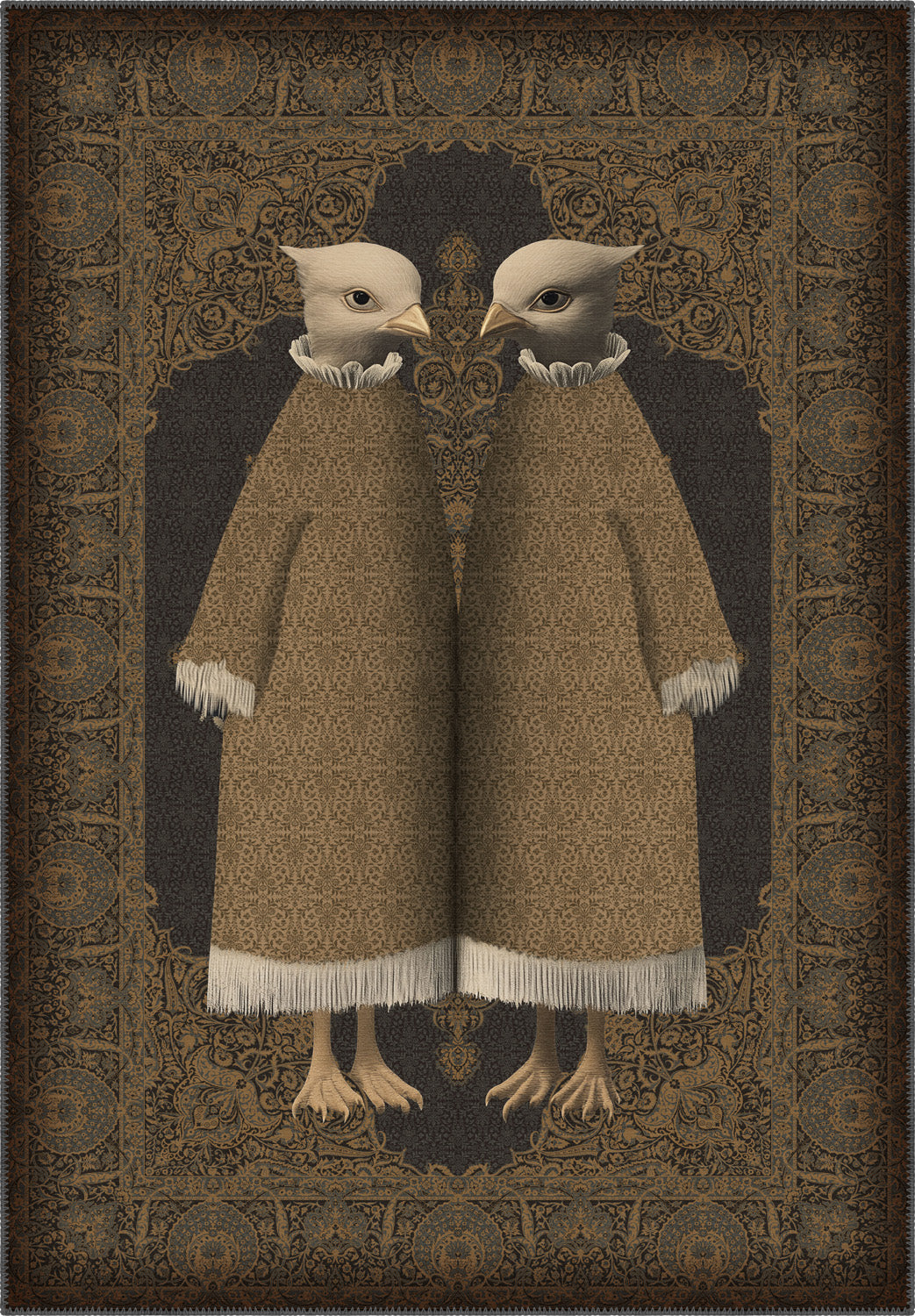 Step into a dreamlike narrative with the Elda Sisters Avant-Garde Rug – a collector’s piece that blurs the lines between fine art and interior design. Framed in a rich tapestry of ornamental motifs, this rug features two anthropomorphic bird-like figures dressed in monastic robes, locked in silent, uncanny communion. A creation that speaks volumes without uttering a word.