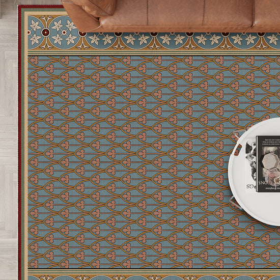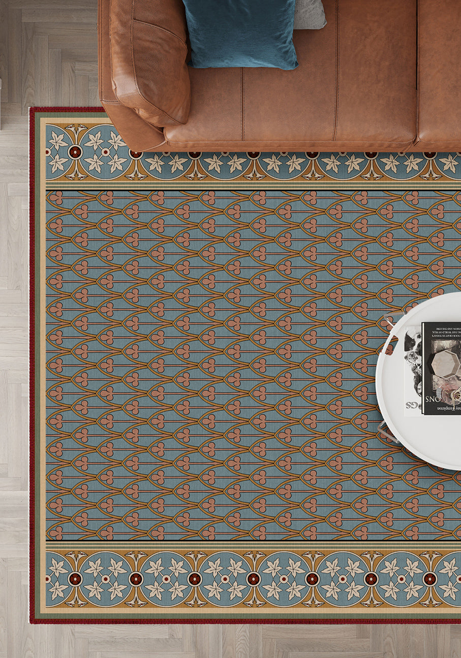 There’s something cathedral-like in the way the Eloise Gothic Lattice Rug repeats its pointed arch motif—almost as though the spirit of a medieval rose window has been softly unfurled across a floor. The rich midnight teal background plays host to elegant terracotta tracery, creating a layered effect that feels architectural yet warm. Along the sides, round floral medallions bloom in soft ivory and blush, framed in golden detailing that adds a regal finish.