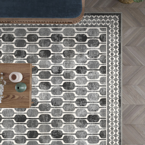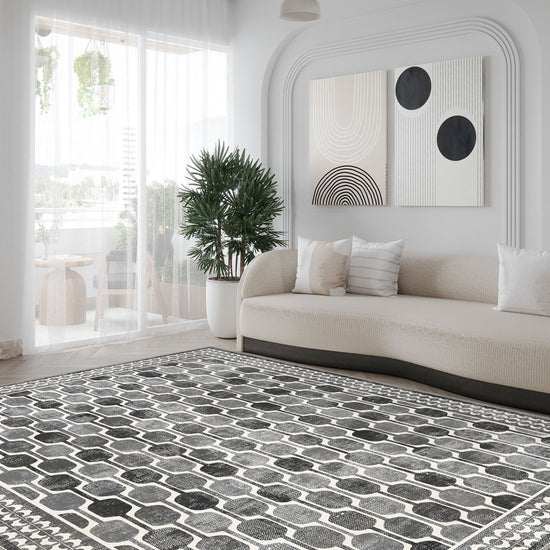 Elevate your interior with the Elvara Bordered Grey Washable Rug, a sophisticated blend of modern style and timeless design. Featuring a stunning geometric pattern in varying shades of grey and white, this rug offers versatility and elegance for any room. The intricate border detailing balances the contemporary pattern, making it the perfect addition to minimalist, industrial, or classic spaces.