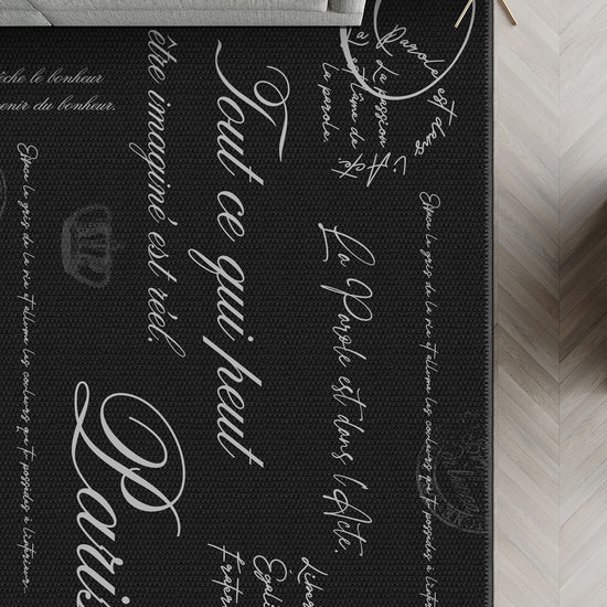 The Emeric Parisian Document Rug captures the poetic soul of Paris in every thread. A tapestry of handwritten French phrases—softly scrawled across a rich charcoal backdrop—this design evokes vintage letters, whispered thoughts, and quiet café mornings. It's the perfect blend of literary charm and moody elegance.
