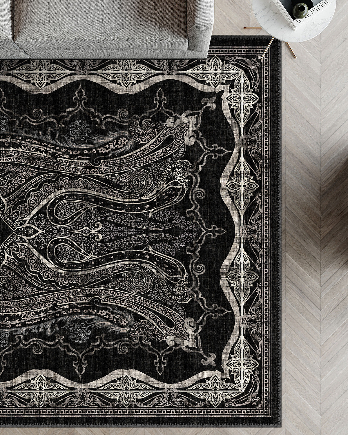 If your aesthetic leans towards traditional rugs, monochrome rugs, or statement black rugs with heritage depth, Farid delivers drama without excess. It feels cultured, considered and undeniably powerful.