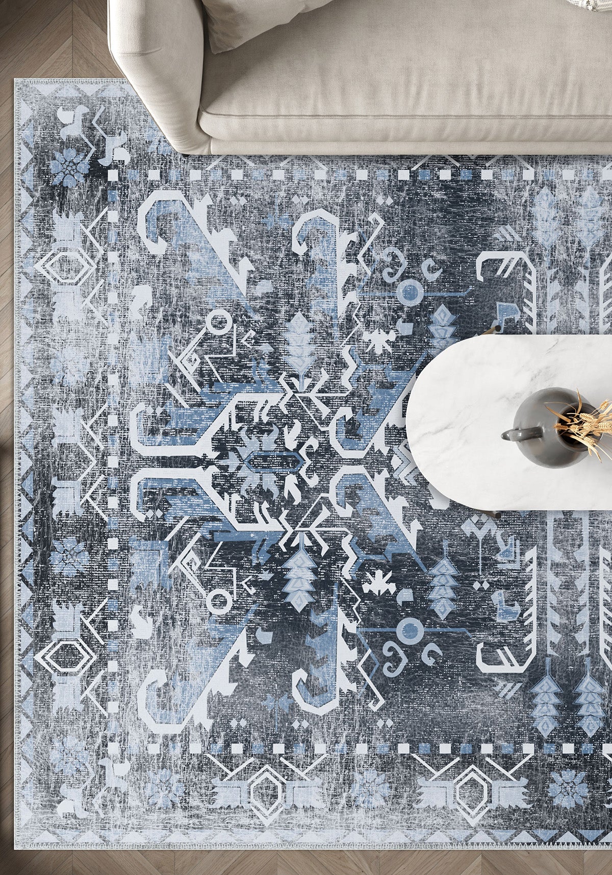 Grace Blue Erased Washable Rug – Modern Elegance with a Distressed Touch