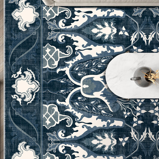 The Henry Blue Distressed Rug combines sophisticated design with modern convenience. Its elegant blue tones and intricate patterns offer timeless beauty, while its machine-washable and durable construction ensures lasting practicality. Add a touch of elegance to your home with this exquisite rug.