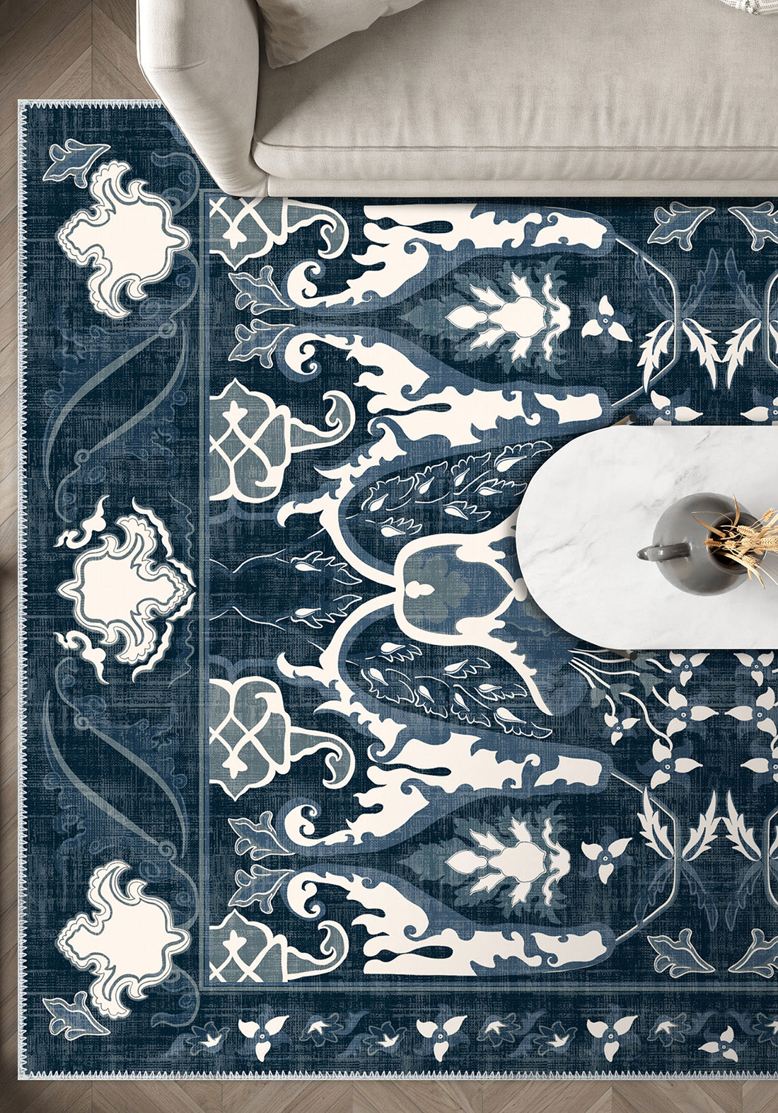 - Elegant blue tones with intricate patterns and a distressed finish