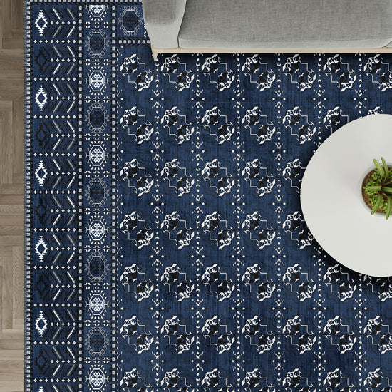 The Kael Blue Washable Rug channels the symmetry and structure of a traditional Bokhara rug, dressed in a deeply elegant navy palette. Its geometric medallions and intricate border deliver timeless charm, while the rich blue brings a grounding calm to your interior.