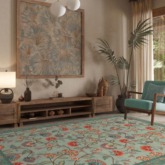 Floral motifs weave gracefully across the surface, their curling forms reminiscent of vintage paisley rug artistry. The leafy border enhances the structure, while the refreshing palette makes this green rug versatile enough for romantic, transitional, and vintage-inspired interiors.