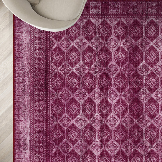Infused with vintage charm, the Larona Vintage Pink Rug is a perfect blend of classic beauty and modern practicality. Its intricate lattice pattern, delicately framed by a traditional border, is softened by a distressed finish, giving it an elegant, timeworn appeal. The deep pink tones bring warmth and sophistication, making it a striking addition to any space.