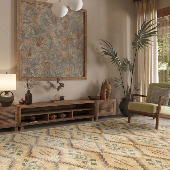 The Leo Yellow Distressed Rug features a dynamic geometric design in warm yellow tones, accented with subtle green and beige patterns. Its distressed finish adds a rustic charm, making it perfect for both contemporary and bohemian interiors. This versatile rug brings a cozy yet stylish feel to any space.