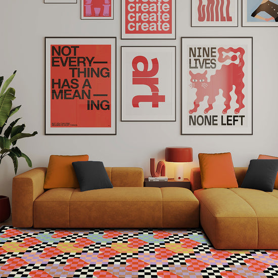 If Wes Anderson had a rug phase, this would be it. The Lolly Checkered Heart Rug is an unapologetic celebration of joy, geometry, and pure affection. With red hearts nestled in a hypnotic black-and-white checkered background, interspersed with soft pastel blocks, this rug is a declaration of love—for your space and your style.