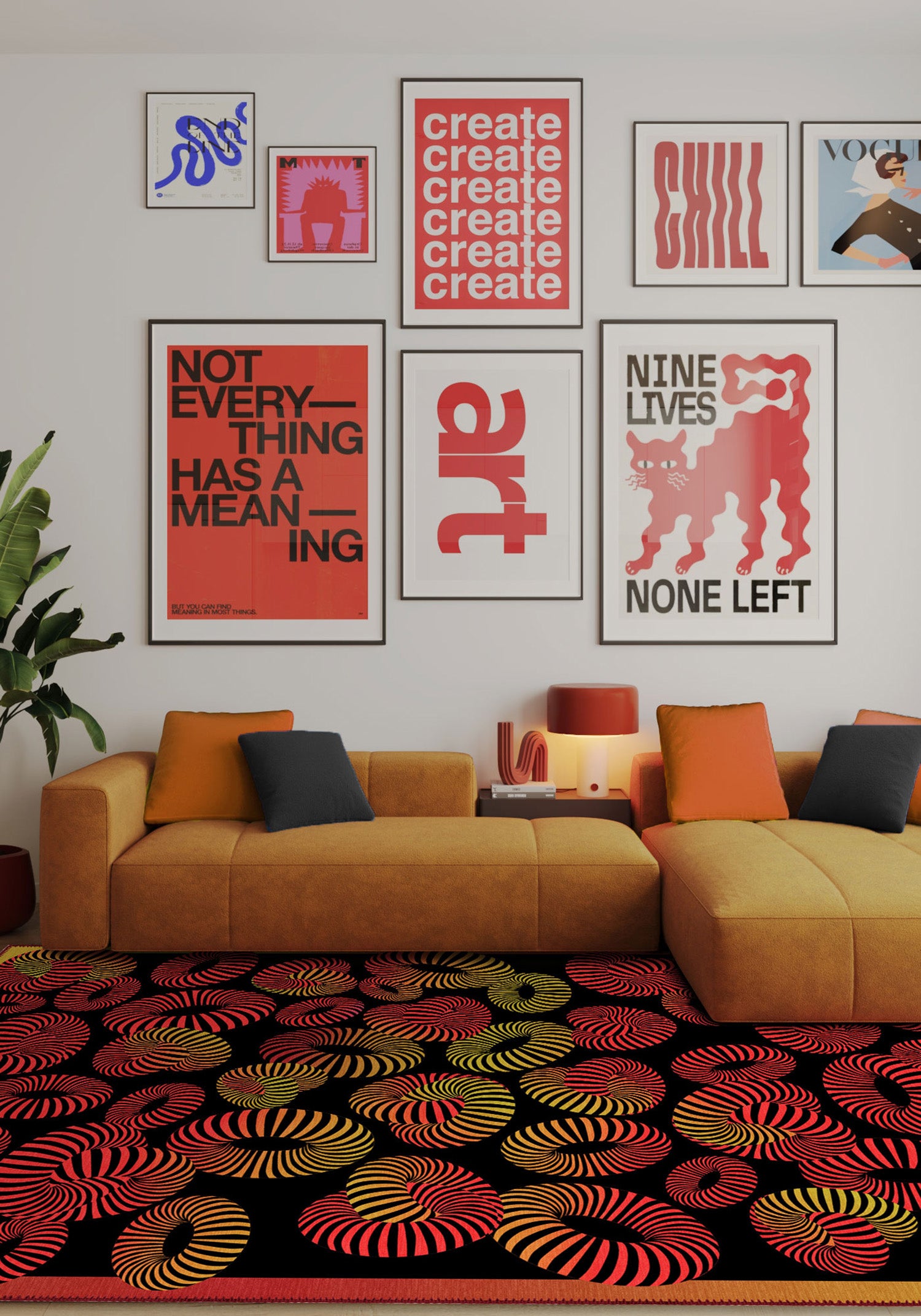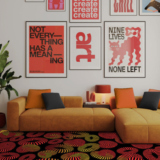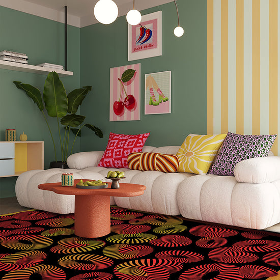 The Lorelai Colourful Geometric Rug isn’t for the faint of heart—it’s for the ones who love drama, movement, and unapologetic design. With swirling 3D stripes in fiery red, golden ochre, and electric orange set against deep black, this rug feels like a visual dance floor. It’s modern, bold, and full of life—designed to spark joy in every corner it touches.