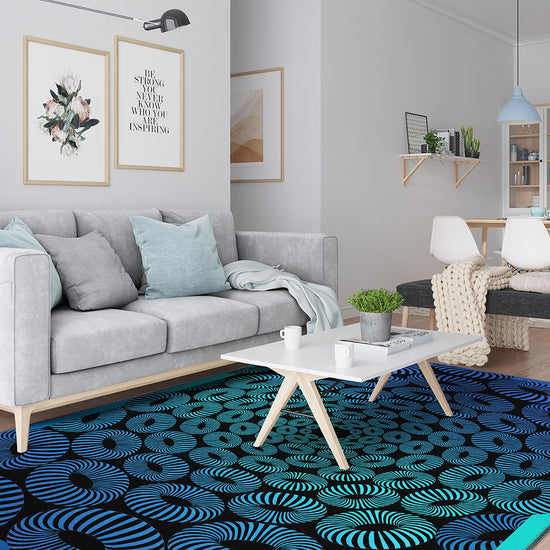 The Lorelai Optical Art 3D Rug pulls you in—literally. With its swirling formation of blue-striped torus shapes, this rug creates an astonishing illusion of depth that feels like stepping into a kinetic art installation. The electric palette of cyan, teal, and midnight blue amplifies the 3D spiral, making it the ultimate centrepiece for a space that doesn’t shy away from boldness.