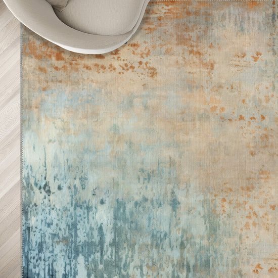 Transform your living space with the stunning Lydia Modern Abstract Rug. This abstract design, blending earthy oranges with cool blue hues, is reminiscent of nature's most breathtaking landscapes. Its modern, fluid pattern creates a visual masterpiece that brings both warmth and sophistication to any room.