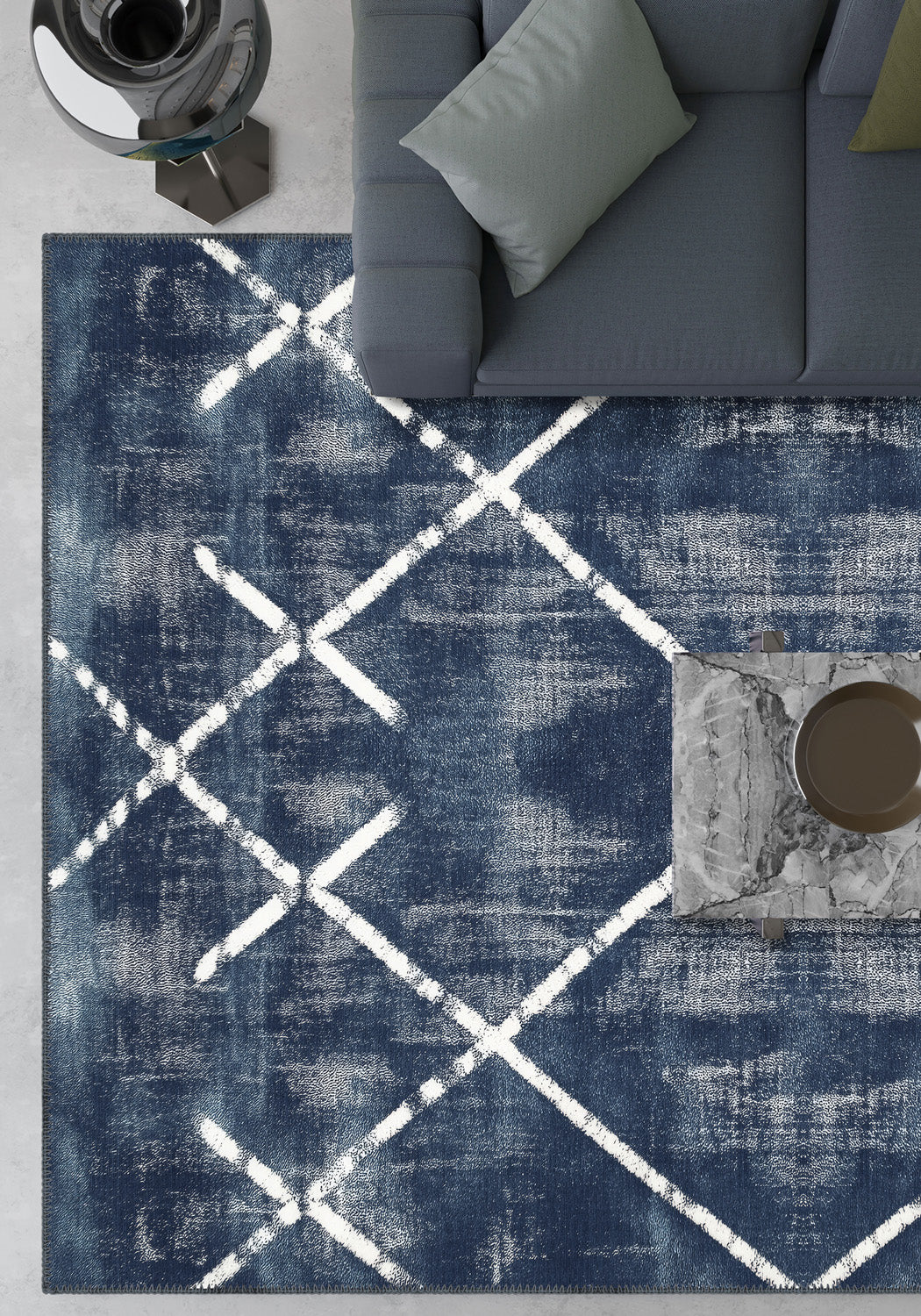 The Margot Washable Blue Rug brings a dramatic and modern aesthetic to any room with its bold, crisscross geometric design over a deep blue background. Perfect for creating a focal point, this rug combines a modern yet timeless pattern with the added convenience of being machine washable, making it both stylish and practical for busy homes.