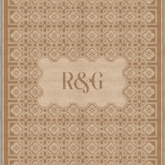 - Intricate Geometric Border: The rug’s design showcases a refined geometric pattern that beautifully frames the monogram, adding sophistication and detail to your decor.