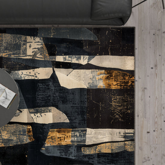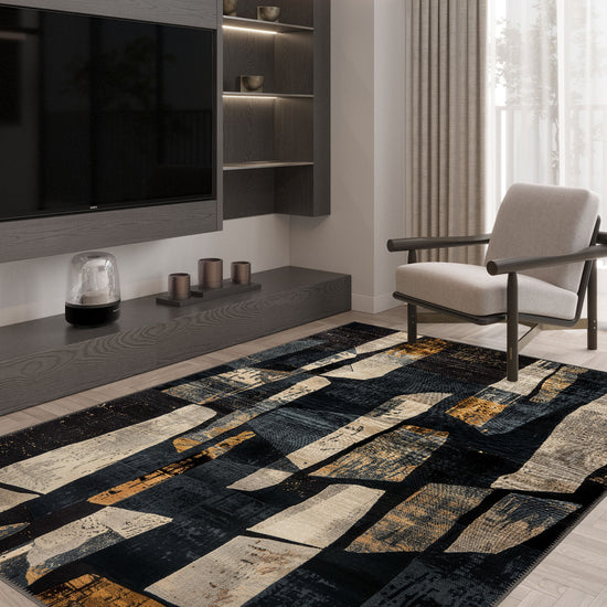 The Meliora Washable Contemporary Rug is perfect for modern homes that embrace bold design and functionality. Featuring a striking abstract pattern in shades of grey, navy, black, and copper, this rug instantly transforms any room into a contemporary haven. Its washable material adds practicality to its striking aesthetic, making it a go-to choice for both style and ease of care.