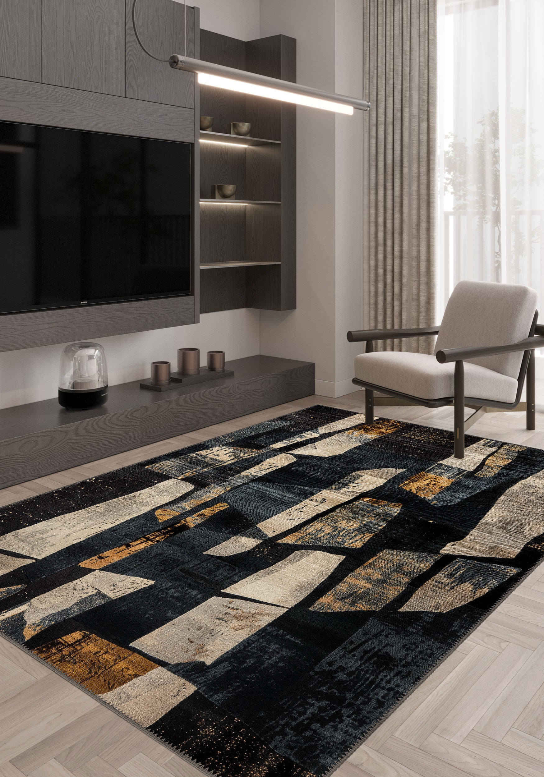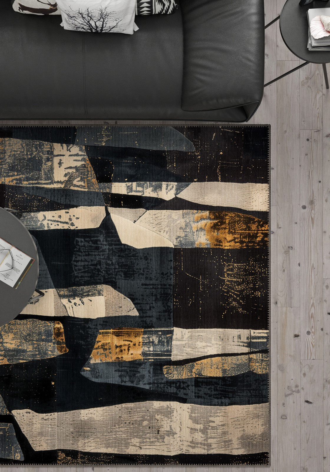 - Modern Colour Palette: A sleek combination of black-blue, grey, and copper tones allows this rug to complement minimalist, industrial, and contemporary interiors.
