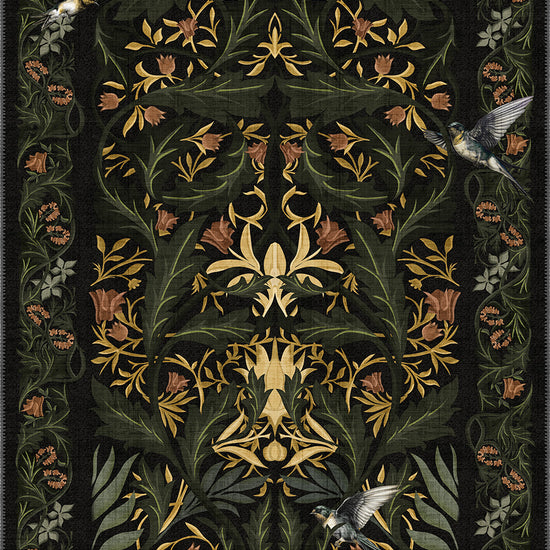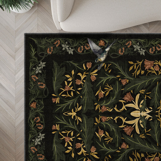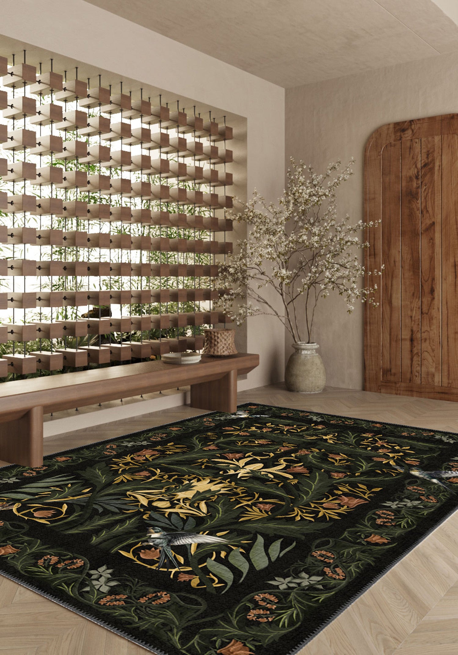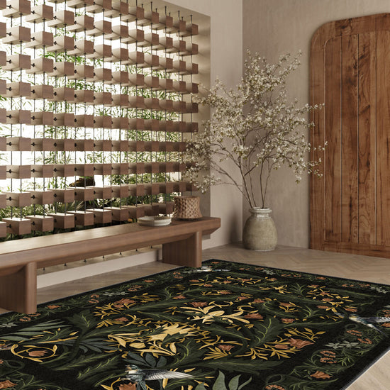 The Merillo Black Botanical Rug is a striking masterpiece that brings the allure of intricate floral patterns to life. Set against a deep black background, its lush intertwining foliage, delicate blossoms, and gracefully detailed birds create a mesmerising visual symphony. The intricate border framing enhances the rich botanical elegance, making this rug a statement piece for any space.