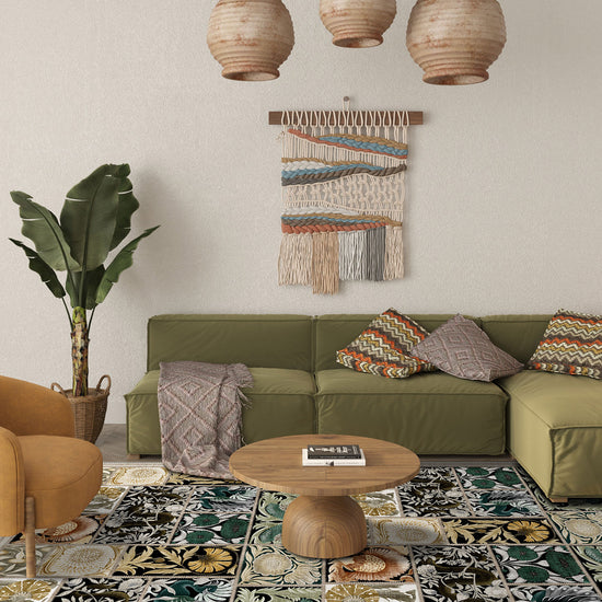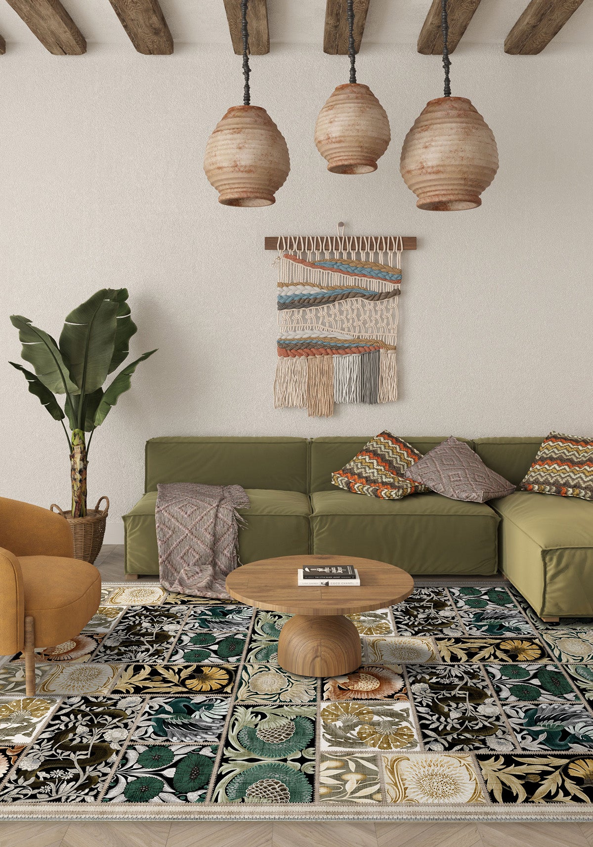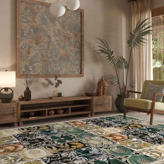The Nerida Art Deco Rug isn’t just a floor covering—it’s a gallery wall for your feet. Rich in detail and full of vintage soul, this striking patchwork-style design features stylised florals and mythical foliage in a palette of ochre, sage, teal, ivory, and charcoal. It’s equal parts William Morris style and art deco opulence, with a maximalist edge that somehow still feels composed.
