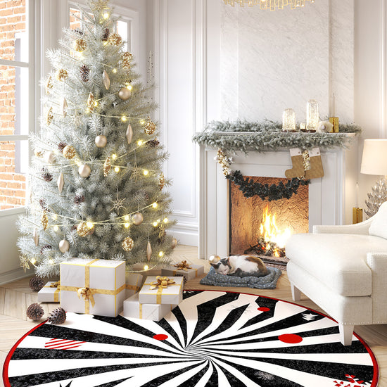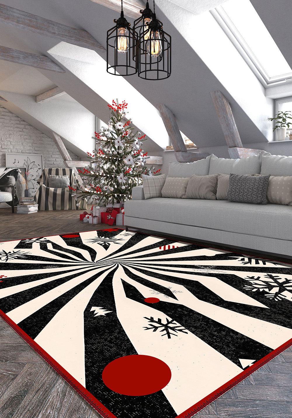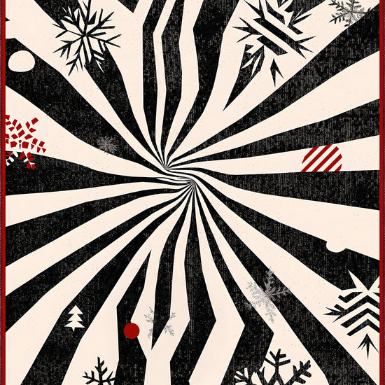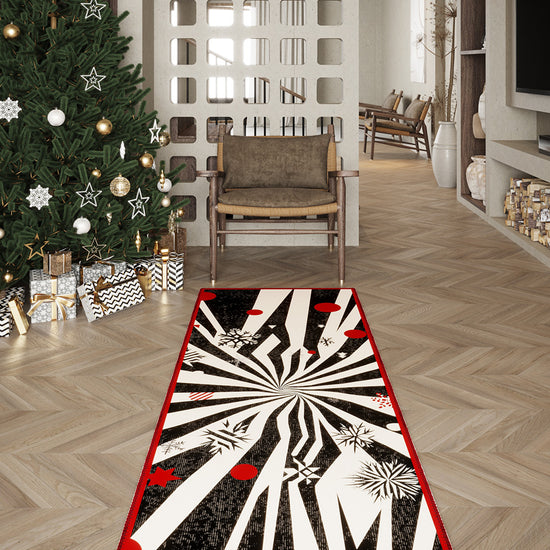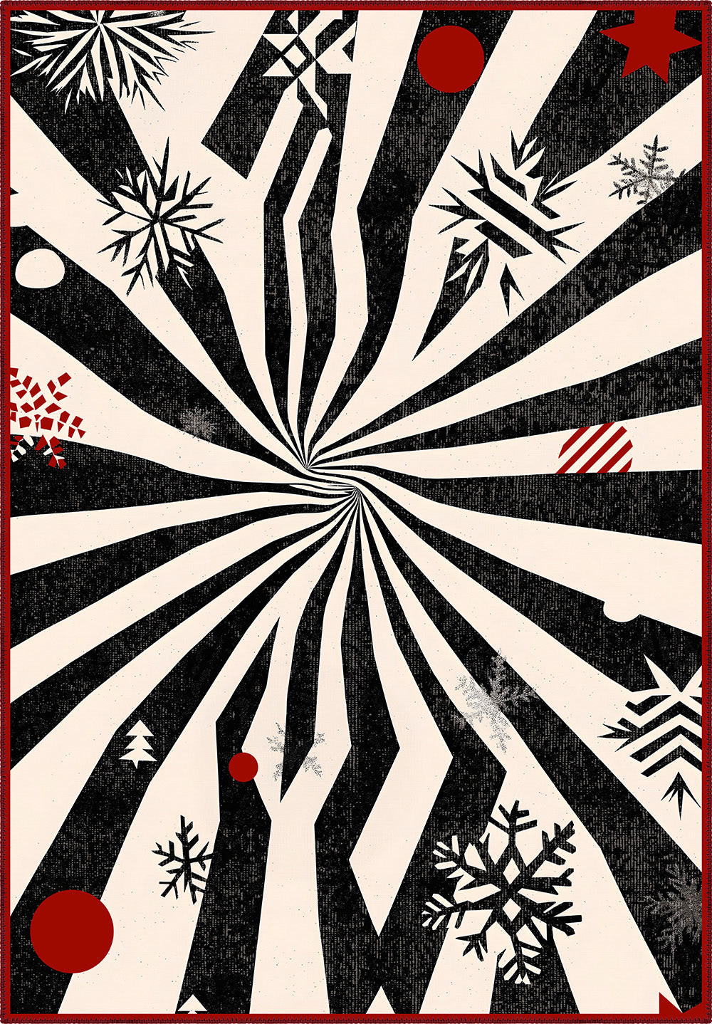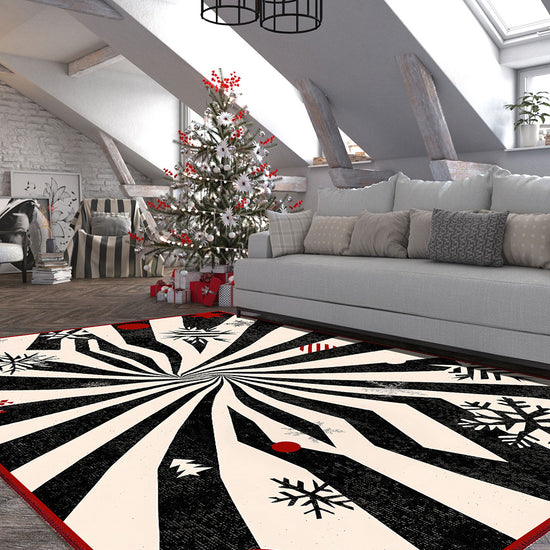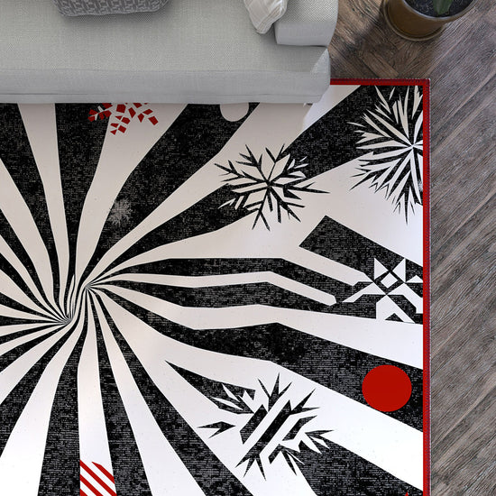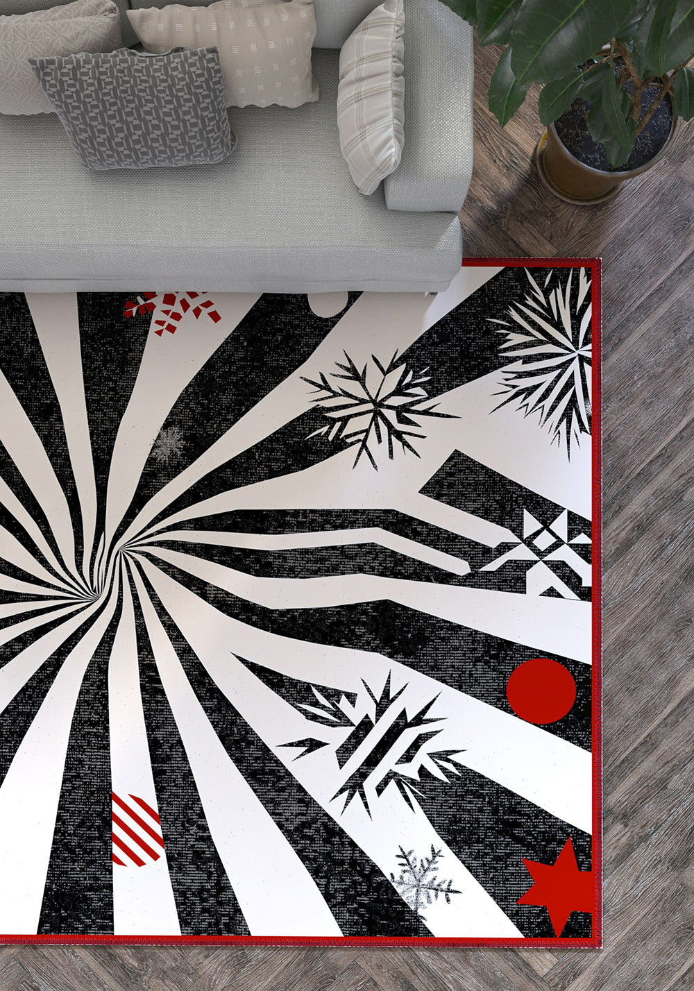 Step into a world of contemporary Christmas cheer with the Noel Modern Christmas Rug. This striking rug features a mesmerizing spiral design in black and white, punctuated by festive elements like snowflakes, stars, and bold pops of red. Its modern aesthetic makes it the perfect choice for those who want to add a unique and eye-catching touch to their holiday décor.