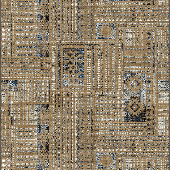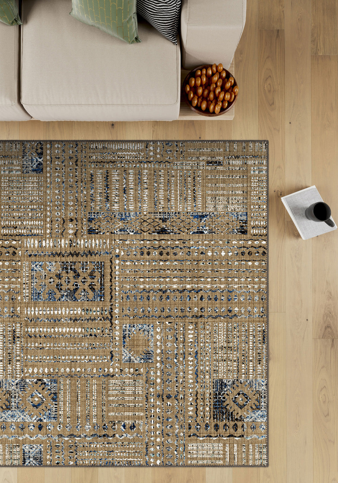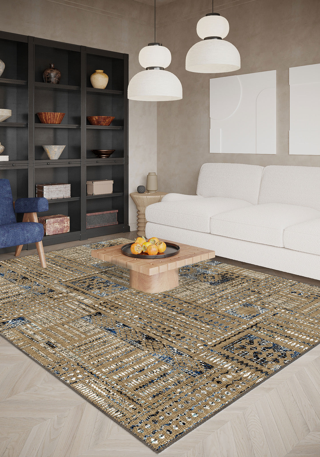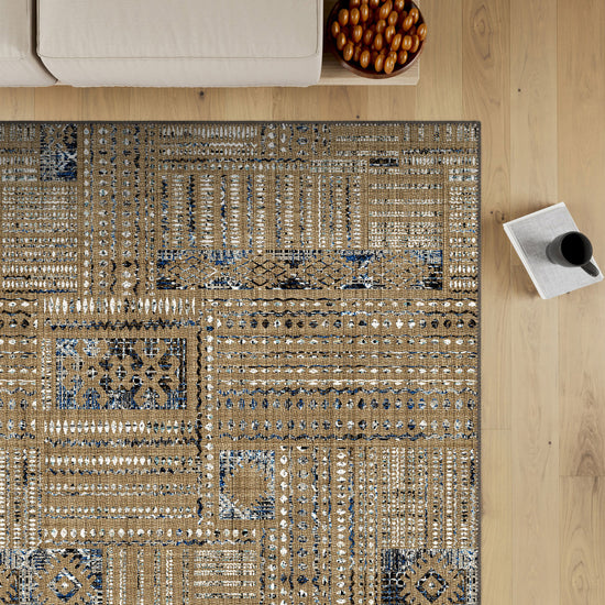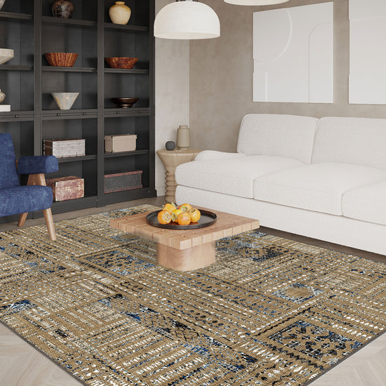 The Nora Abstract Brown Modern Rug showcases an intricate abstract design, blending earthy brown tones with subtle accents of blue and beige. This modern piece brings a refined yet cozy atmosphere to any room, offering a versatile style that pairs well with contemporary, rustic, or industrial interiors.