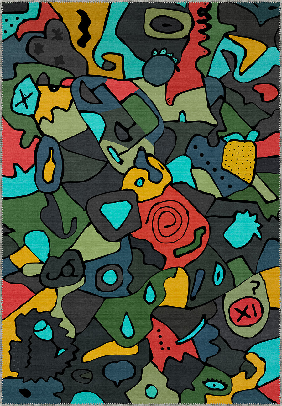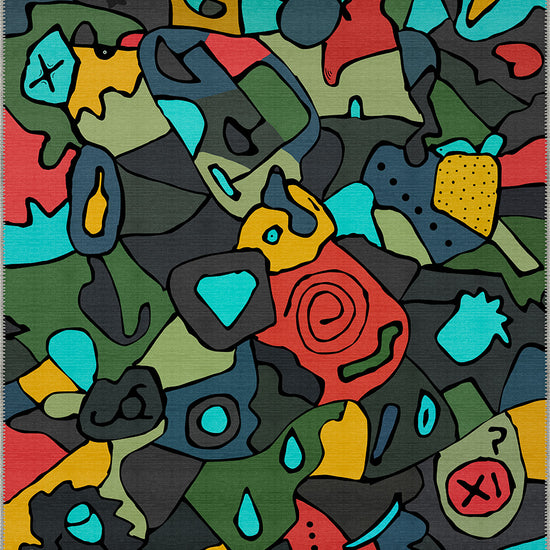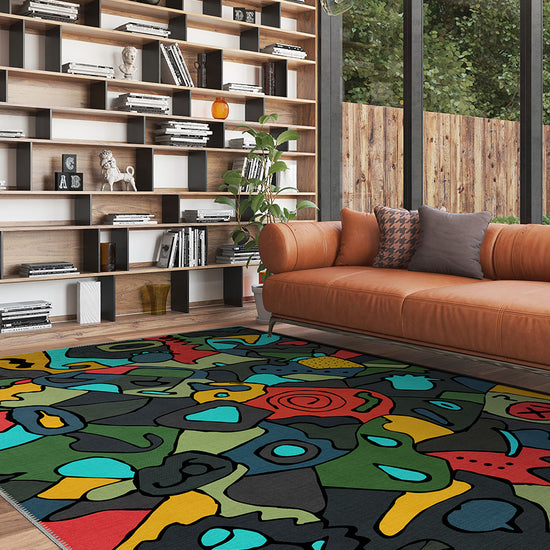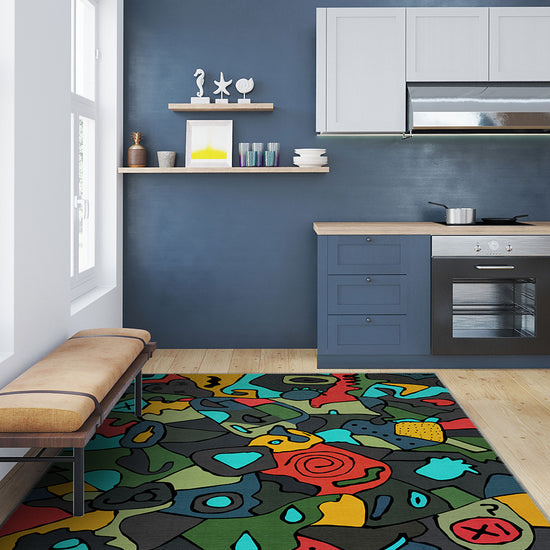 The Ondine Colourful Modern Rug is a vibrant celebration of abstract expression, blending bold shapes, dynamic lines, and a rich colour palette. Shades of blue, green, red, and yellow contrast against a deep black backdrop, creating a visually striking composition that brings energy and creativity into any space. The playful yet structured design makes this rug a statement piece for contemporary interiors.