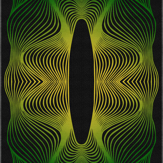The Optio Black Green Futuristic Rug is a striking fusion of bold symmetry and vibrant hues, designed to captivate the eye and energize your space. Featuring a mesmerizing gradient of deep emerald and golden tones against a sleek black background, this rug brings a futuristic edge to any contemporary setting.