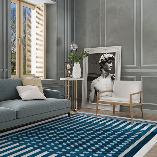 Designed with architectural clarity, the Quillon Blue Rug is a masterclass in precision. Wide navy and sky-blue columns frame a central grid of rhythmic rectangles, evoking the elegance of woven textiles, tiled courtyards, or Bauhaus geometry. Every line feels purposeful, every stripe measured.