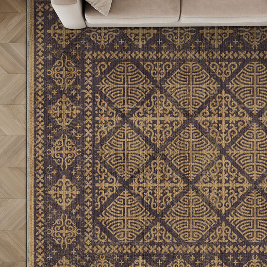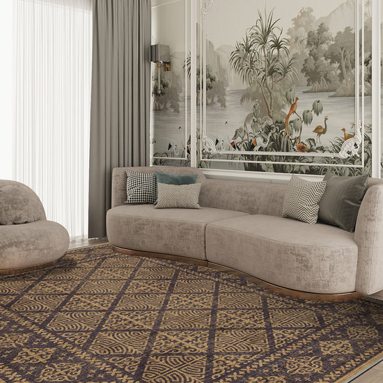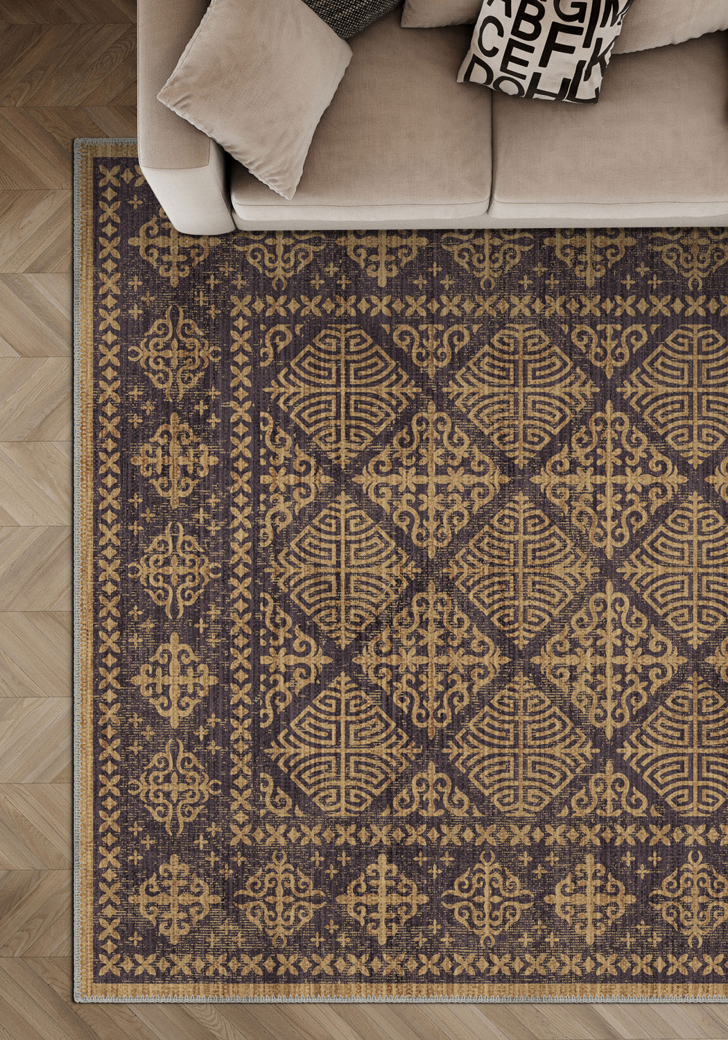 If you’ve been longing for a rug that doesn’t whisper but confidently speaks, the Rhean Deep Lavender Rug is your match. A rich, dramatic tapestry of dark lavender and antique gold, its geometric medallions and tribal motifs evoke the elegance of ancient civilisations reimagined for the modern home. Each diamond tile feels almost architectural—like the floor of a Moorish courtyard at twilight.