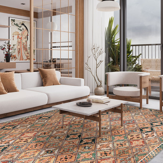 The Romilly Colourful Ethnic Washable Rug is an artwork underfoot, bursting with a symphony of muted greens, terracotta reds, and warm neutrals, all arranged within a hypnotic ethnic lattice design. Every diamond motif whispers of tradition, while the charming irregularity of the colours feels refreshingly modern.