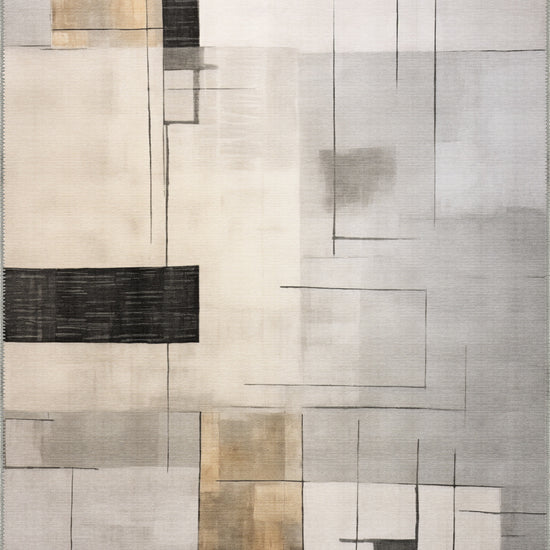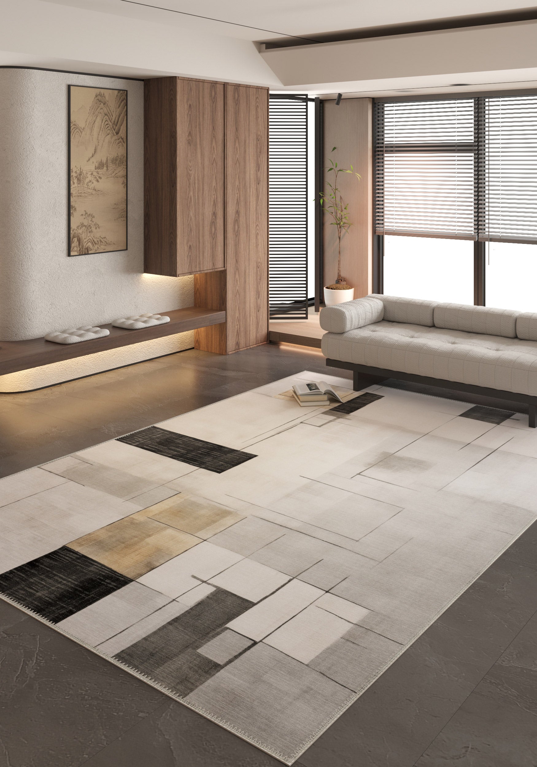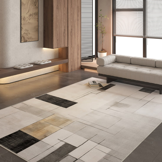 - Abstract Geometric Design: The rug features a stunning geometric pattern with clean lines and blocks of color that create a modern, minimalist aesthetic.