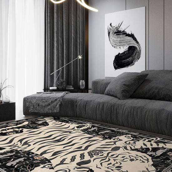 - Striking black and white animal print rug with mystical detail