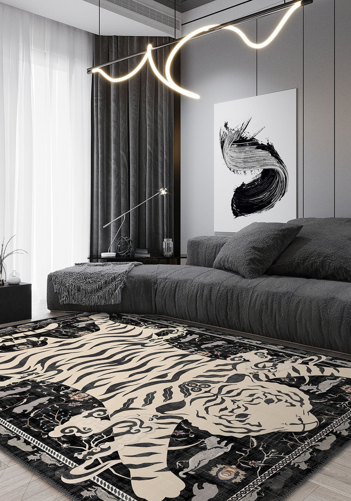 This is more than just an animal printโitโs a protector for your space. Perfect for a bold office or mancave, layered in a dark-toned living room, or used to anchor a dramatic bedroom, the Tashi rug commands attention while remaining rooted in ancient iconography.