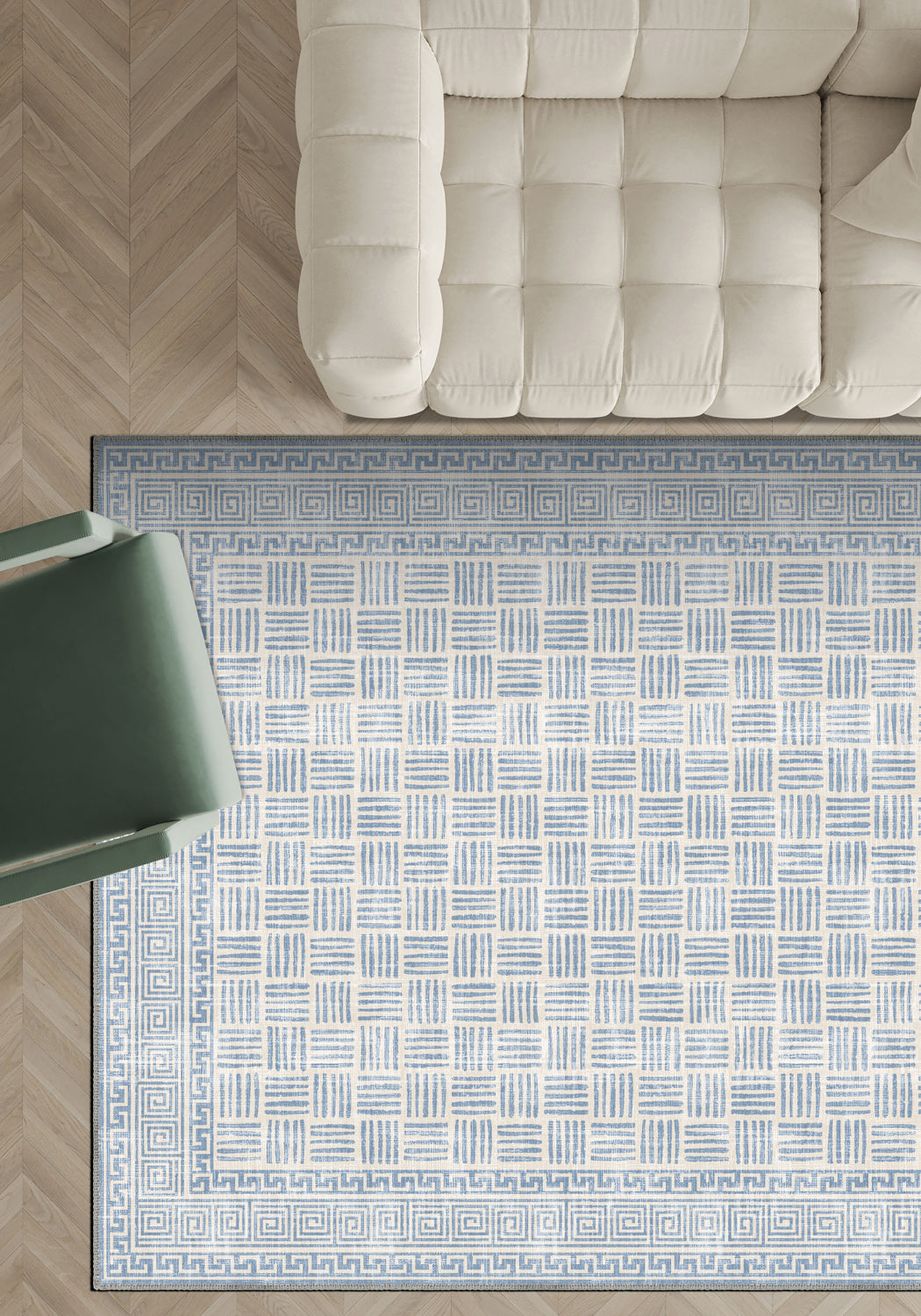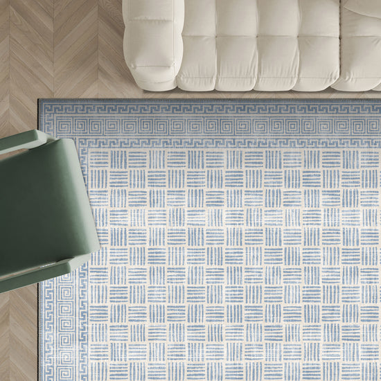 The Vincent Geometric Blue Rug feels fresh, structured and beautifully composed. With its soft blue tones layered over an elegant geometric grid and framed by a refined Greek key border, this design brings clarity and balance to any interior.