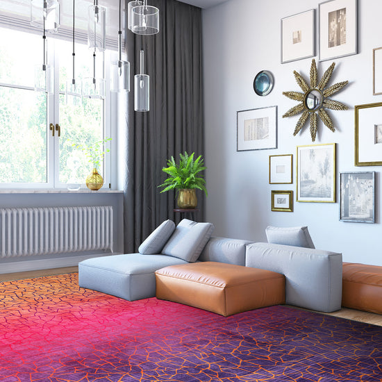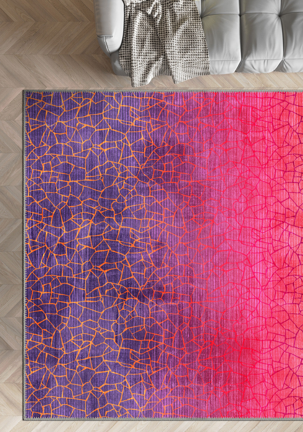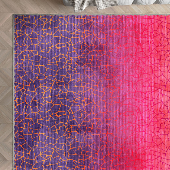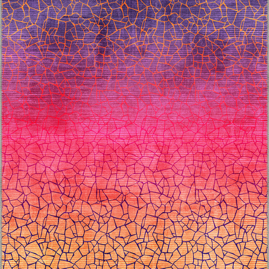 Bring the heat of neon nights and twilight skies to your space with the Wesley Washable Neon Rug. A radiant gradient shifts from burnt orange to electric pink to deep indigo, layered beneath a cracked geometric web. It’s equal parts fiery, futuristic, and fabulous.